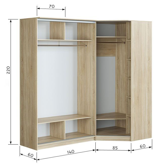 Современный угловой шкаф решит проблему хранения одежды и домашних принадлежностей даже в небольшом помещении. Эргономичный и вместительный, он с разумной прагматичностью использует каждый сантиметр пространства. Доступ к внутренней части получается легким благодаря современной системе направляющих. А наличие ленты-щетки предотвращает попадание пыли внутрь шкафа, а так же способствует бесшумному открыванию и закрыванию створок.