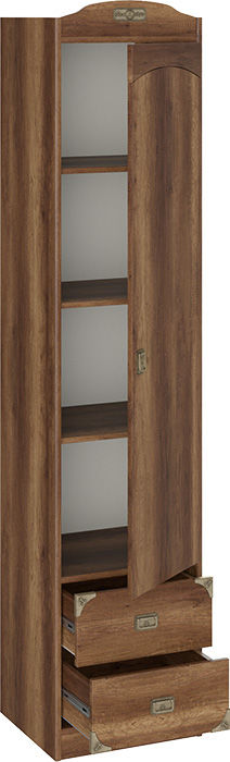 Распашной шкаф для белья один из модулей детской серии Навигатор. В дизайне линейки использована морская тематика: корпус и фасады оттенка состаренного дерева выгодно дополнены металлическими уголками и фурнитурой под бронзу. Традиционное наполнение делает систему хранения универсальной для любой обстановки.