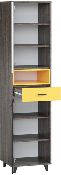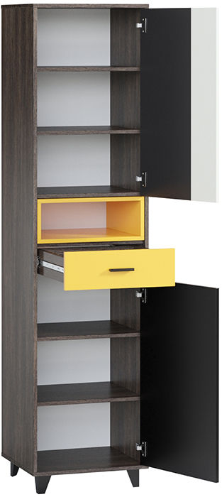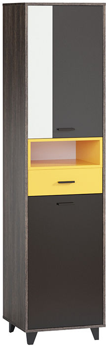 Яркая, динамичная серия Концепт придется по душе активным и современным натурам. Актуальная модульная коллекция подойдет для обстановки гостиной или спальни. Распашной шкаф Концепт-2 отличается компактными габаритными размерами и повышенной функциональностью. Конструкция состоит из трех частей: верхняя и нижняя оснащены глухими дверцами, центральная открытая.