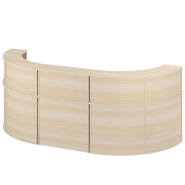 Стойка ресепшн округлая с нишами внутри, выполнена из ЛДСП, толщина столешницы 22 мм, боковые стенки ? 16 мм. Торцы деталей обработаны противоударной износостойкой кромочной лентой ПВХ толщиной 2 мм немецкого концерна ?REHAU?. Крёпежная и лицевая фурнитура производства России. Комплект состоит: ПСУ-70 Угловой элемент 112*112*118 см - 2 шт, Н-83 Надставка на стол 90*32*42 см - 1 шт, СТЦ-41 Стол с царгой в пол 90*60*76 см - 1 шт. * дополнительно можно заказать стяжки в стоимость не включено