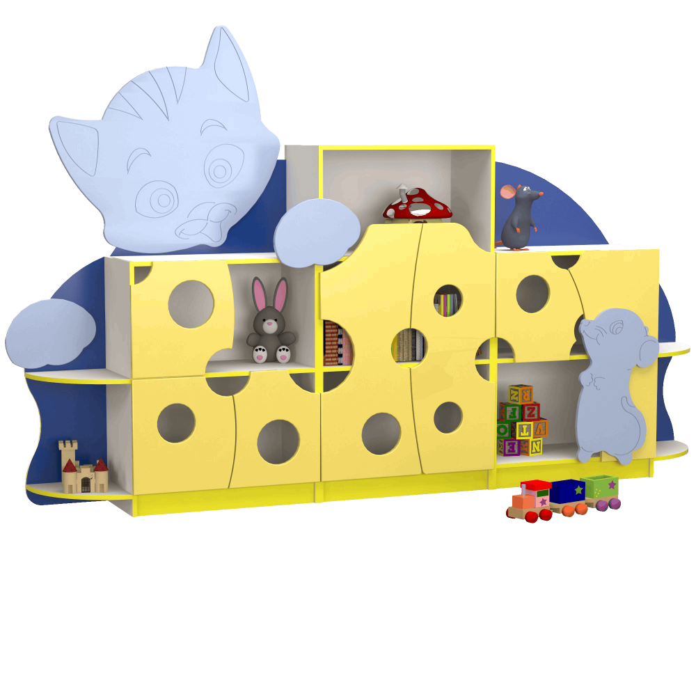 Детская стенка для игрушек ?Кошки-мышки? предназначена для оборудования детских садиков, игровых зон в дошкольных учреждениях и торговых центрах. Имеет оригинальный дизайн, способствующий развитию фантазии, творческих способностей ребенка. Декорирована яркими фасадами из МДФ в виде любимых мультипликационных героев ? станет отличной заменой старым и серым шкафам. Необычные элементы и яркая цветовая гамма украсят любой интерьер, обеспечив детям позитивное настроение.Имеет множество полочек, открытых и закрытых ниш, чего достаточно для хранения игрушек, учебных материалов и других вещей. Разработана таким образом, чтобы все необходимые для малыша предметы были в свободном доступе, и он мог самостоятельно складывать их на место. Все выступающие элементы скруглены, что исключает риск повреждений. ДСП и МДФ, из которых модель изготовлена, имеют сертификаты качества и соответствуют стандартам ГОСТ.Основные характеристикиГабариты детской игровой стенки: 2700х350х1725 мм.Мебель не требует особого ухода ? достаточно периодически протирать ее поверхность от пыли мягкой тканью.Универсальность модели ? подходит для детей разного возраста.Вес изделия составляет 110 кг.Гарантийный срок эксплуатации ? 1 год.Оформление заказа в нашем интернет-магазинеВ ассортименте представлен широкий выбор стенок для игрушек в детский сад по оптимальным ценам. Оплатить покупку можно наличным или безналичным платежом. Обратите внимание, что стоимость доставки и сборки оплачивается отдельно. Доставка осуществляется по указанному адресу с помощью удобных для вас транспортных служб. На сайте представлены номера телефонов наших менеджеров на случай возникновения вопросов. Не пропускайте обновления сайта, выгодные акции и скидки.