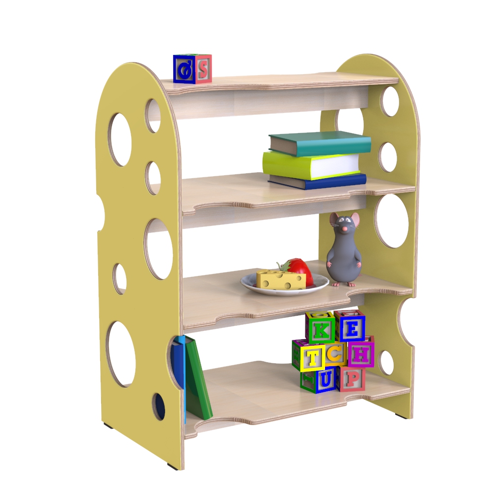 Детский стеллаж для игрушек ?Сыр? поможет создать в комнате малыша или игровой зоне дошкольного учреждения уютную атмосферу. Приятный цвет и оригинальный дизайн в виде сыра обязательно понравятся каждому ребенку. Модель отлично дополнит разнообразные интерьеры детских комнат и игровых зон в дошкольных учреждениях.Конструкция разработана таким образом, что все необходимые предметы находятся в свободном доступе для малышей. Они в любой момент смогут взять и поставить на место необходимую вещь без помощи взрослых. Модель не имеет острых углов, что делает ее безопасной для маленьких детей.Основные характеристики изделияРазмеры детского стеллажа: 780х640х1040 мм.Имеет 4 вместительные полочки для размещения книг, игрушек, сувениров и других вещей.Для изготовления изделия использована фанера, толщиной 15 мм, покрытая пластиком.Вес стеллажа составляет 31 кг.Конструкция имеет двойные ножки-гвоздики, что защищает напольное покрытие от повреждений.Мы предоставляем гарантийный срок эксплуатации на 12 месяцев.Оформление заказаМы предлагаем доступные цены на детские стеллажи, так как являемся непосредственным производителем мебели. Чтобы оформить покупку, заполните необходимые поля на сайте. Оплата заказа возможна наличным и безналичным платежом. Доставка товаров осуществляется в любой регион Украины удобными для вас транспортными службами. Услуги доставки и сборки оговариваются и оплачиваются отдельно. На сайте представлены номера телефонов для связи с нашими менеджерами.