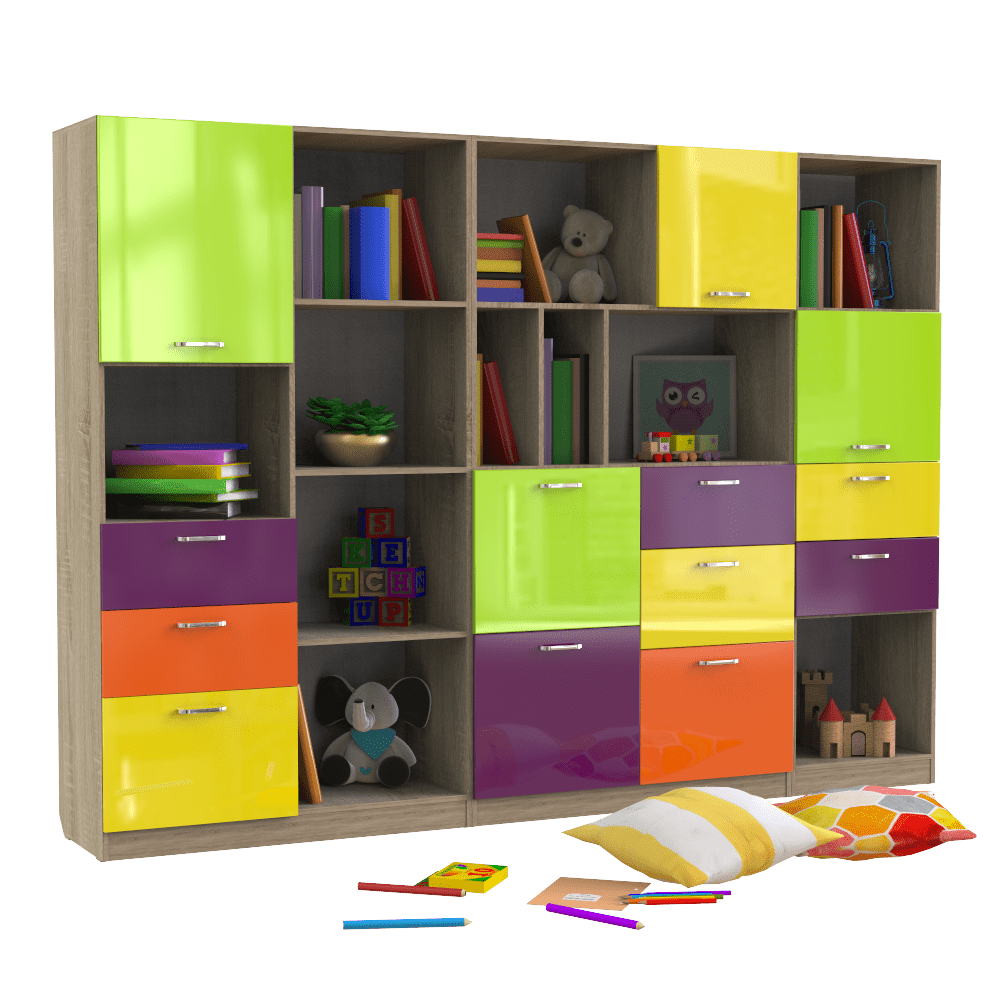 Стенка для игрушек ?Неон 1? состоит из нескольких модулей. Предназначена для оборудования детских комнат, дошкольных образовательных учреждений, игровых зон. Корпус изготовлен из ДСП, толщиной 16 мм, фасады ? МДФ, покрытого глянцевой пленкой. Материалы имеют все сертификаты качества и соответствуют стандартам ГОСТ. Особенностью этой коллекции является интересное сочетание цветов и материалов, что делает стенку по-настоящему эксклюзивной.Представляет собой конструкцию с множеством полочек, выдвижных ящиков, открытых и закрытых ниш ? вы сможете хранить все необходимые вещи и игрушки в свободном для детей доступе. Покупка такой функциональной мебели обойдется дешевле, чем каждого элемента отдельно. На ваш выбор представлено несколько цветовых решений корпуса: Белый, Черный, Дуб Сонома.Главные характеристикиРазмеры стенки в детский сад: 2750х450х2000 мм.Гармонично впишется в интерьер комнаты девочки или мальчика. Хорошо сочетается с другими элементами мебели.На торцы нанесена кромка ПВХ, толщиной 0,5 мм, для защиты от повреждений и влажной среды.Вес изделия ? 239 кг.Гарантийный срок эксплуатации составляет 12 месяцев.Особенности оформления заказаМы предлагаем вам приобрести стенки для игрушек в детский сад по выгодным ценам с удобными вариантами оплаты и доставкой по Украине. Оплата товаров возможна наличным или безналичным платежом. Стоимость доставки оплачивается отдельно, ? осуществляется с помощью транспортных компаний. Чтобы выполнить покупку, заполните необходимые поля на сайте. В случае возникновения вопросов позвоните нашим менеджерам по телефонам, указанным на сайте. Следите за актуальными акциями и скидками.