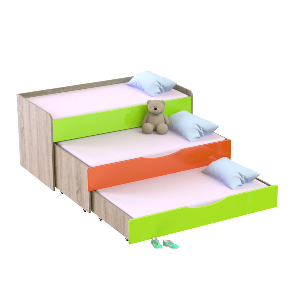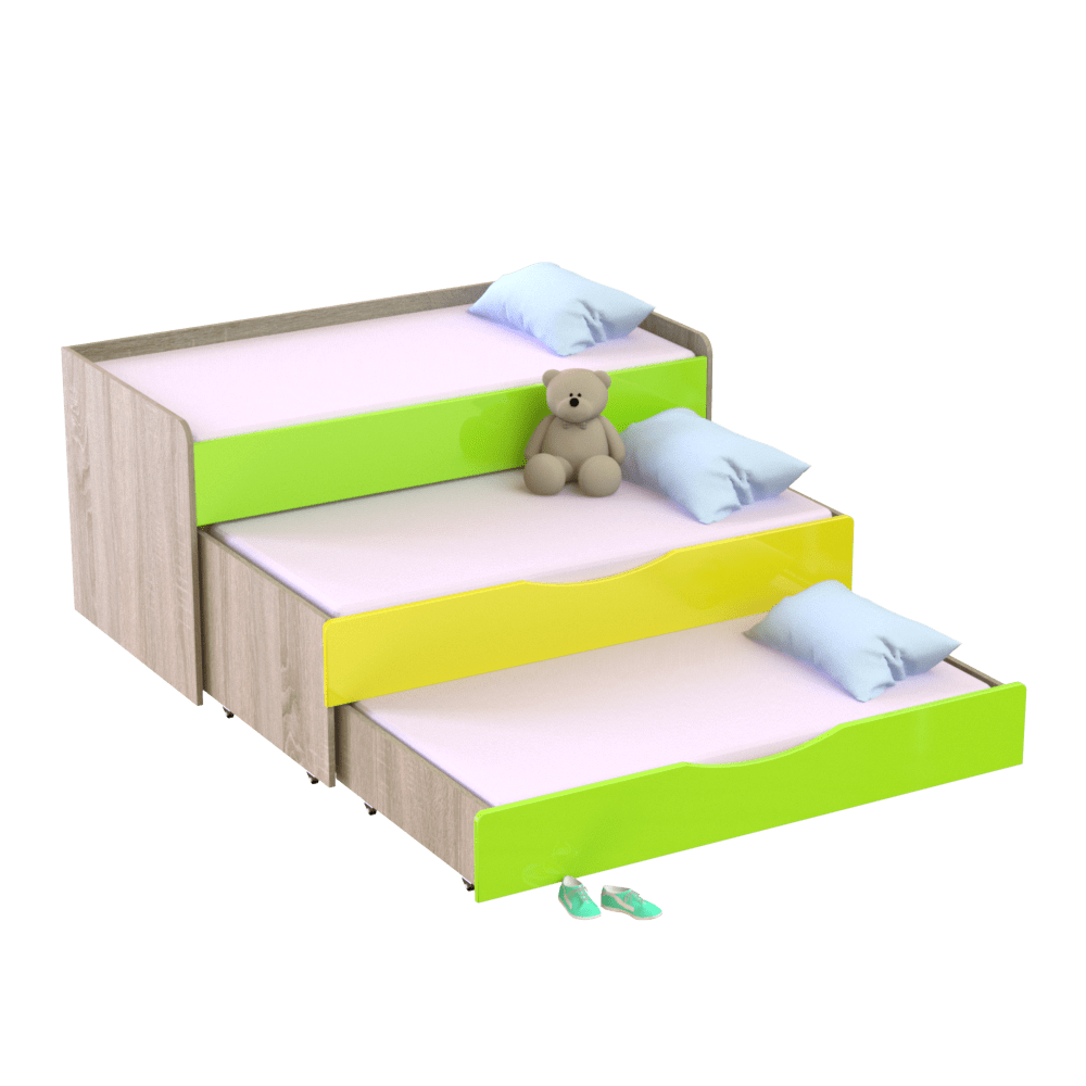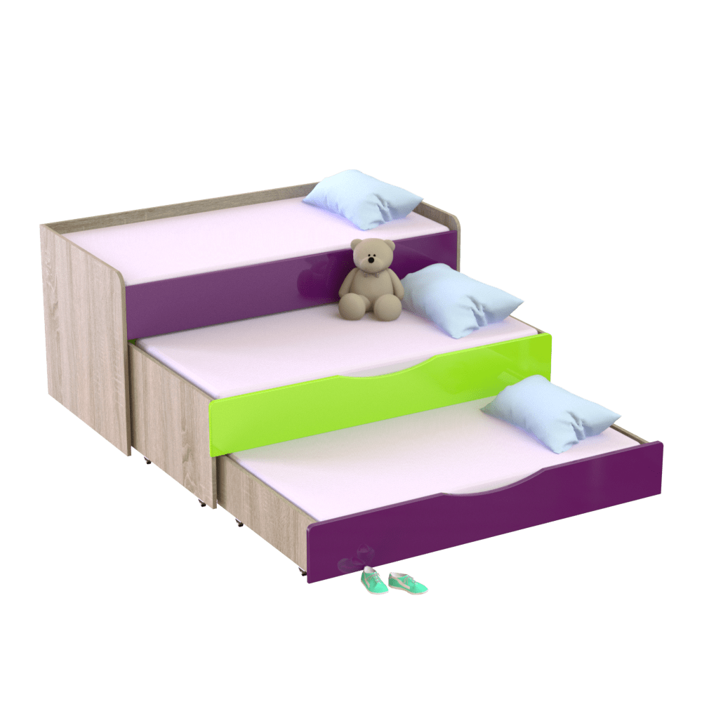 Детская трехъярусная кровать является идеальным решением для обустройства комнат, садиков и других дошкольных учреждений. Занимает минимум места в комнате и оставляет много свободного пространства для игр, спорта и других занятий. Имеет три спальных места, два из которых выдвигаются с помощью роликов. Если у вас два ребенка, нижний ярус можно использовать как дополнительный ящик для игрушек и белья, что очень удобно. Третье спальное место можно применить на случай прихода гостей с ночевкой.Изготовлена из экологически чистых, гипоаллергенных и износостойких материалов ? ЛДСП и МДФ, которые подтверждены сертификатами качества. Имеет надежную конструкцию со скругленными углами, что исключает риск повреждений во время активных игр малышей. Входит в коллекцию мебели ?Неон? ? фасады покрыты глянцем. Оформлена в современном дизайне, благодаря чему гармонично впишется в любой интерьер детской комнаты.Главные характеристики моделиШирина: 1522/1522 мм. Глубина: 650/1850 мм. Высота: 865/865 мм.Основа изделия ? прочный металлический каркас и ДСП толщиной 16 мм.Вес изделия составляет 112 кг.На ваш выбор представлено несколько цветовых решений ЛДСП и комбинаций МДФ, что позволяет выбрать наиболее выигрышный вариант под ваш интерьер.Гарантийный срок эксплуатации ? 1 год.Особенности оформления заказа в нашем интернет-магазинеУ нас вы можете купить кровать трехъярусную детскую и другую мебель по оптимальной цене, так как мы являемся прямым производителем. Доставка осуществляется во все регионы Украины в кратчайшие сроки с помощью транспортных компаний. Для оплаты вы можете выбрать наличный и безналичный расчет. Следите за обновлениями сайта и выгодными акционными предложениями.