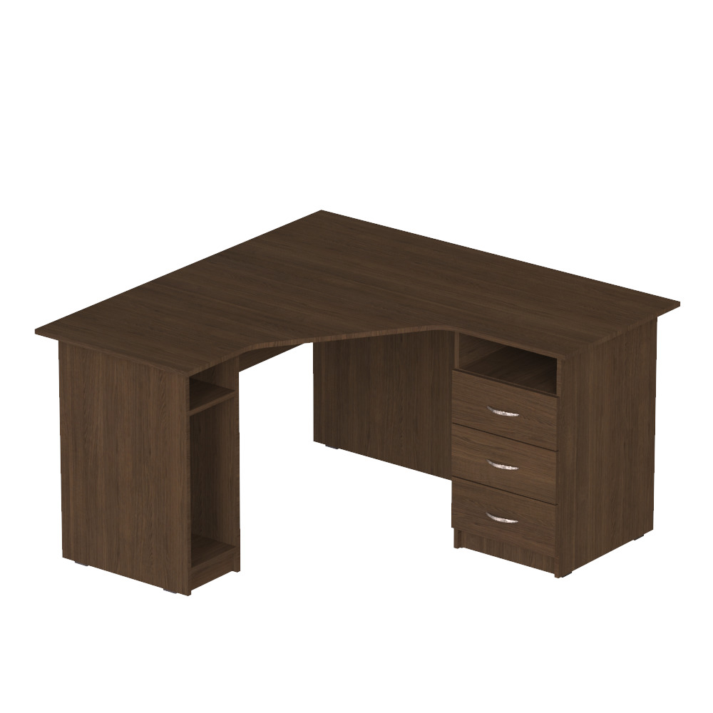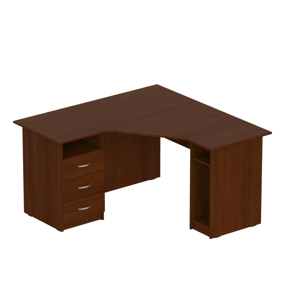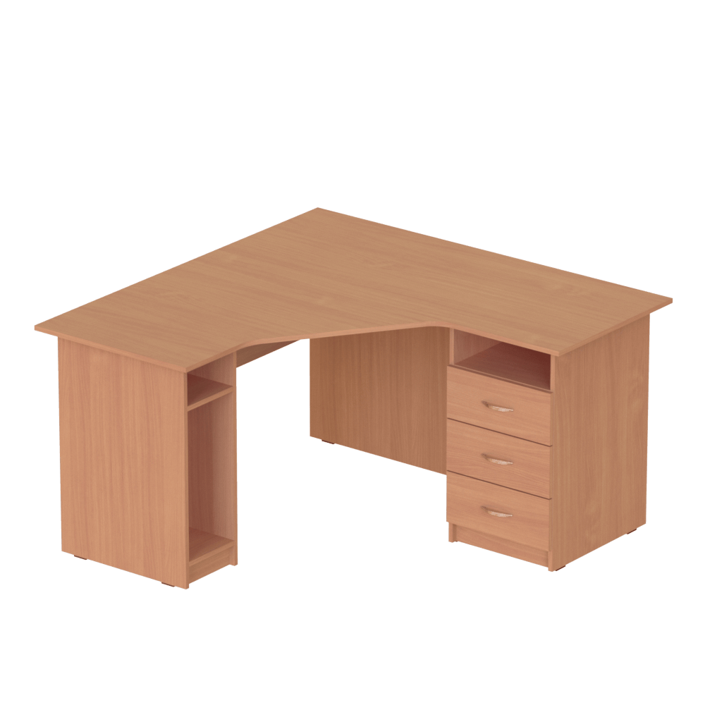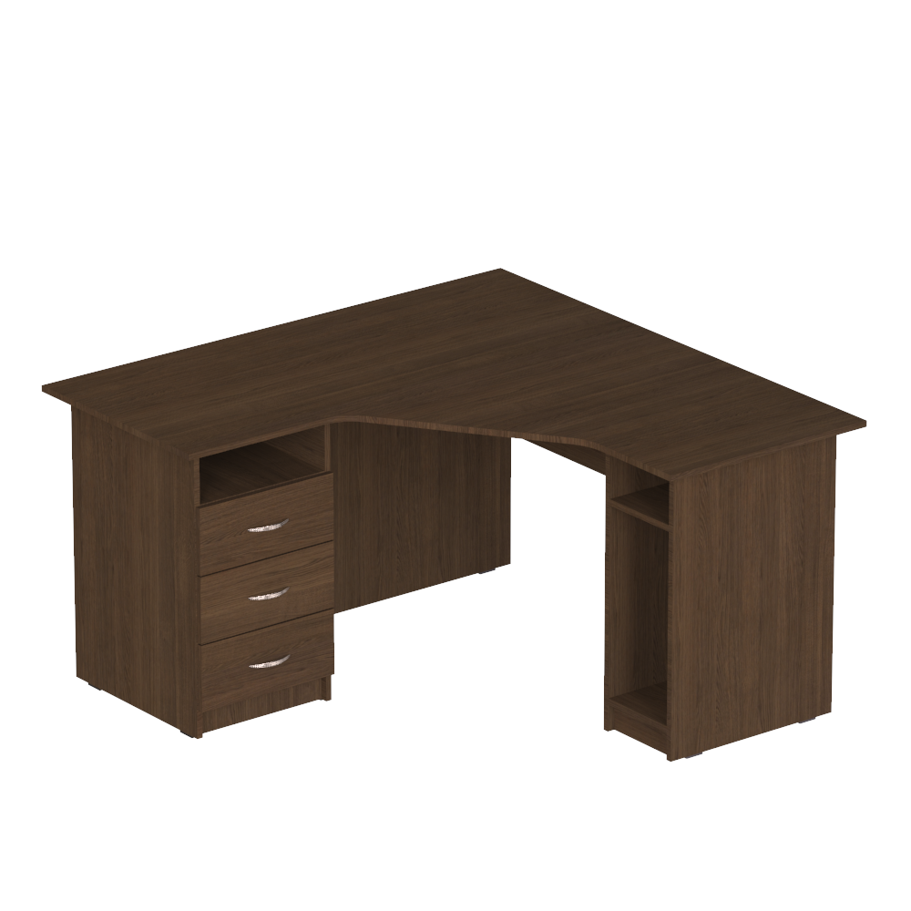 Вместительная и достаточно крупная модель, идеально подходящая для тех, кто хочет купить угловой рабочий стол в офис, кабинет или себе домой. Углы ? наименее недооценённая и наименее рационально используемая часть любого помещения. Заказав удобный угловой стол с вместительными ящиками и нишей для системного блока, можно превратить пустовавший доселе угол в полноценное рабочее место.Характеристики моделиСерия: ?Персонал?.Модели: ?П 624?, ?П 626?, ?П 644?, ?П 646?.Вместительный угловой рабочий стол изготовлен из качественной ламинированной ДСП толщиной 16 мм. Торцы материала покрыты ПВХ-кромкой (толщина кромки столешницы ? 1 мм, кромки остальных элементов ? 0,5 мм). Все использованные для изготовления этой модели материалы являются безопасными и разрешёнными к использованию действующим украинским законодательством.Стул оснащён специальной удобной нишей для системного блока, которая защищает его от ударов и лишних передвижений, и тремя вместительными ящиками с полкой. Со стороны сидящего за столом человека столешница имеет удобный эргономичный вырез, который позволяет сотруднику офиса или ученику, который будет работать за этим столом, расположиться удобно, не напрягая спину.Особенности изделияКлиенты, которым необходимы угловые рабочие столы различных габаритов, могут выбрать одну из перечисленных ниже моделей, с разными габаритными размерами и массой:?П 624?, 1200x1400x750 мм, масса 70 кг,?П 626?, 1200x1600x750 мм, масса 76 кг,?П 644?, 1400x1400x750 мм, масса 77 кг,?П 646?, 1400x1600x750 мм, масса 82 кг.Также клиенты могут выбрать один из двух вариантов взаимного расположения отделения с ящиками и ниши для системного блока ? левый (ящики слева) или правый (наоборот). Стоимость изделия указана без учета сборки стола. Хотите приобрести вместительный, надёжный, достаточно крупный стол для компьютера, который можно удобно расположить в углу помещения ? приобретайте эту модель с доставкой в любую точку Украины!