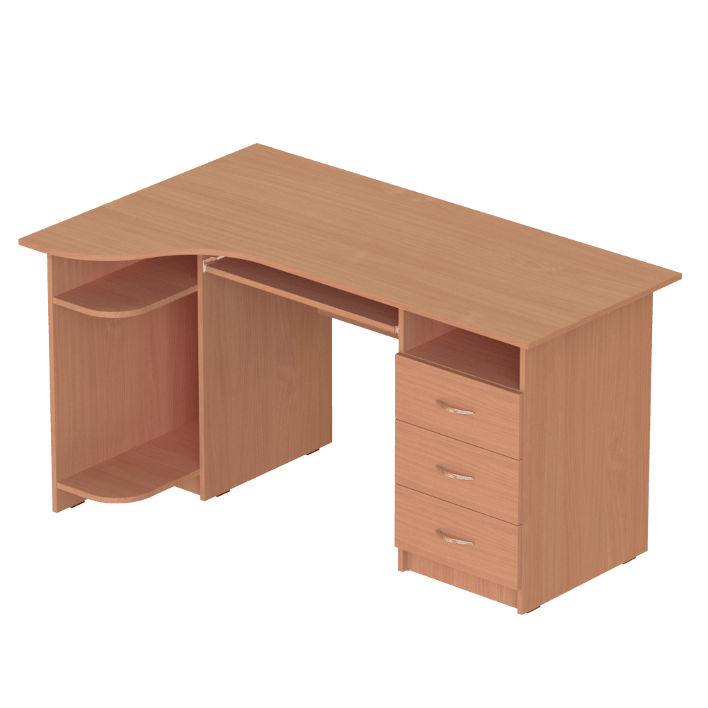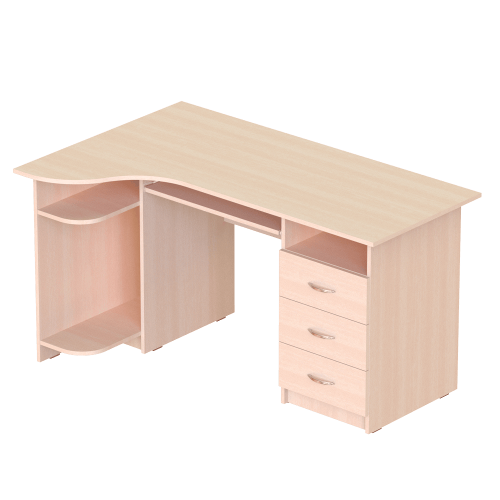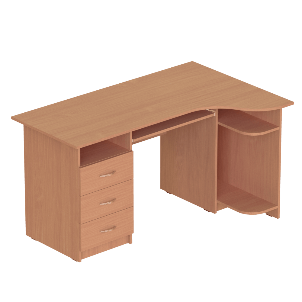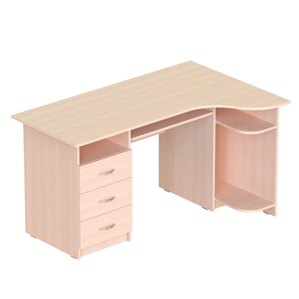 Удобный, вместительный и эргономичный угловой компьютерный стол с ящиками, который позволяет рационально использовать пространство рабочего кабинета, офиса или жилого помещения. Этот стол можно использовать и в качестве рабочего места школьника или студента, и в качестве рабочего места офисного сотрудника, который сидит в углу помещения.Характеристики изделияСтол изготовлен из ДСП класса эмиссии формальдегида Е1. Торцы столешницы покрыты ПВХ-кромкой толщиной 1 мм, торцы других элементов ? ПВХ-кромкой толщиной 0,5 мм. Масса готового изделия составляет 66 кг.С одной стороны стола располагается отделение с полкой и тремя ящиками, с другой стороны ? отделение для системного блока, также с небольшой полкой, расположенной сразу под столешницей. Под столешницей по середине стола расположена выдвижная полка, предназначенная для клавиатуры и мышки. Сто стороны сидящего за столом человека имеется эргономичный вырез, который позволяет работающему за столом человеку сидеть удобно, не напрягая спину, и сохранить осанку.Углы столешницы и полок, расположенные с передней стороны, скруглены, чтобы предупредить повреждение одежды и ушибы. Все материалы, которые были использованы для изготовления этого стола, являются на 100% безопасными и разрешёнными к использованию действующим отечественным законодательством.Особенности и преимущества моделиУдобная модель, прочный, качественный и долговечный угловой компьютерный стол с ящиками. Стильный дизайн этого изделия позволяет разместить его в любом современном офисном интерьере. Изделие изготавливается в срок до 35 рабочих дней, в зависимости от загруженности производства.Большое преимущество специального компьютерного стола ? возможность компактно расположить системный блок в отделении под столешницей, защитить системный блок от случайных ударов и освободить столешницу для личных вещей, документов и прочих офисных бумаг.Заказчики могут выбирать расцветку из 10 предложенных в карточке товара вариантов. Также покупатели могут выбрать один из двух ?зеркальных? по отношению друг к другу вариантов изделия ? в котором отделение с ящиками находится слева или справа. Цена товара указана без стоимости сборки.