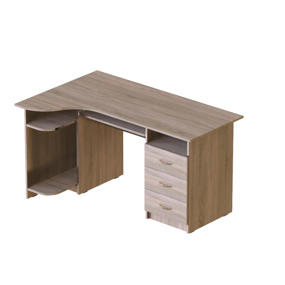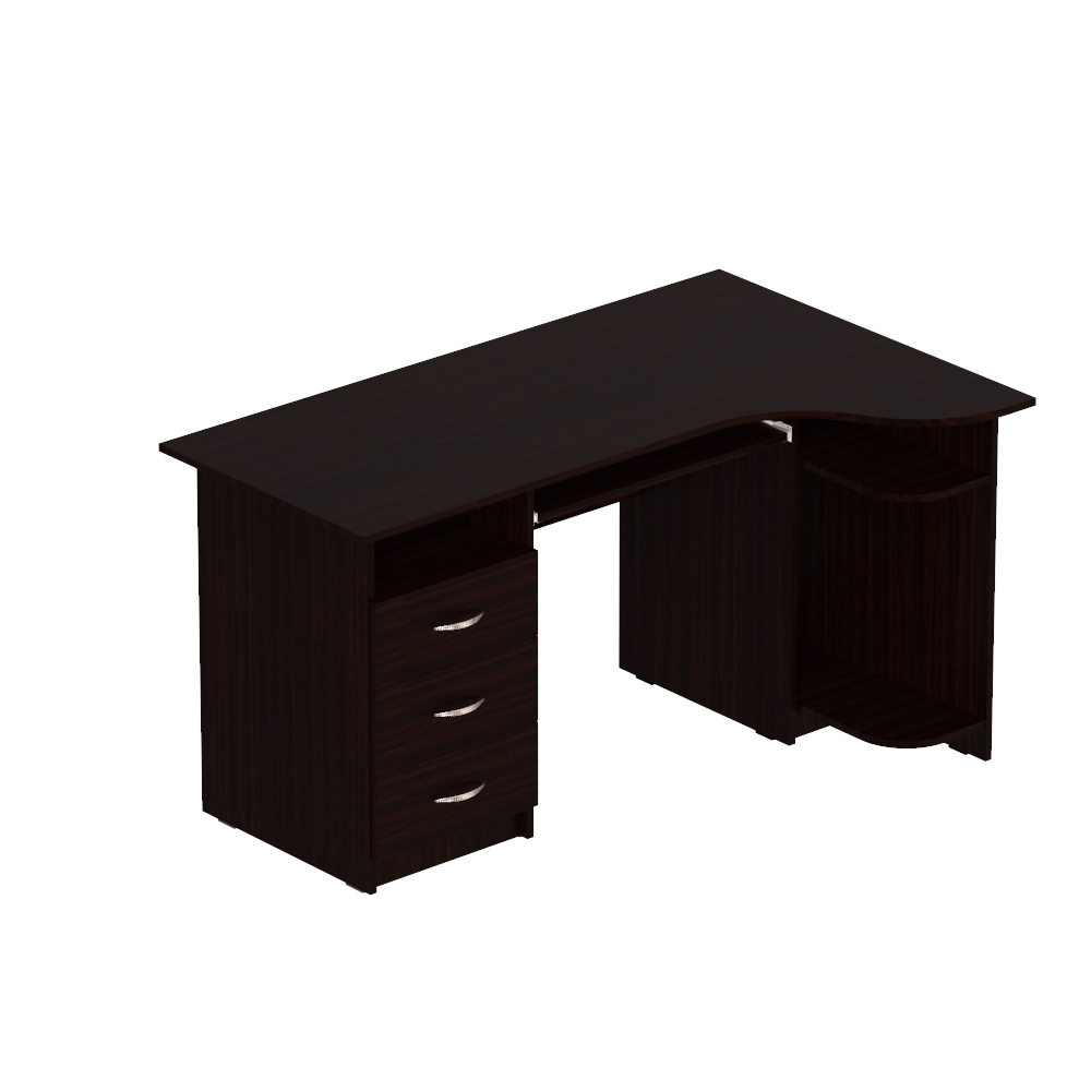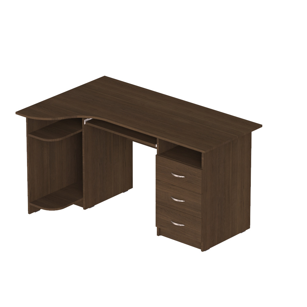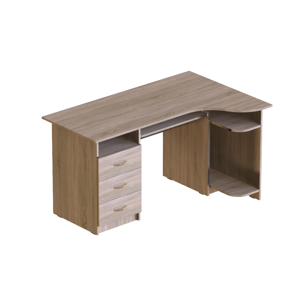 Удобный, вместительный и эргономичный угловой компьютерный стол с ящиками, который позволяет рационально использовать пространство рабочего кабинета, офиса или жилого помещения. Этот стол можно использовать и в качестве рабочего места школьника или студента, и в качестве рабочего места офисного сотрудника, который сидит в углу помещения.Характеристики изделияСтол изготовлен из ДСП класса эмиссии формальдегида Е1. Торцы столешницы покрыты ПВХ-кромкой толщиной 1 мм, торцы других элементов ? ПВХ-кромкой толщиной 0,5 мм. Масса готового изделия составляет 66 кг.С одной стороны стола располагается отделение с полкой и тремя ящиками, с другой стороны ? отделение для системного блока, также с небольшой полкой, расположенной сразу под столешницей. Под столешницей по середине стола расположена выдвижная полка, предназначенная для клавиатуры и мышки. Сто стороны сидящего за столом человека имеется эргономичный вырез, который позволяет работающему за столом человеку сидеть удобно, не напрягая спину, и сохранить осанку.Углы столешницы и полок, расположенные с передней стороны, скруглены, чтобы предупредить повреждение одежды и ушибы. Все материалы, которые были использованы для изготовления этого стола, являются на 100% безопасными и разрешёнными к использованию действующим отечественным законодательством.Особенности и преимущества моделиУдобная модель, прочный, качественный и долговечный угловой компьютерный стол с ящиками. Стильный дизайн этого изделия позволяет разместить его в любом современном офисном интерьере. Изделие изготавливается в срок до 35 рабочих дней, в зависимости от загруженности производства.Большое преимущество специального компьютерного стола ? возможность компактно расположить системный блок в отделении под столешницей, защитить системный блок от случайных ударов и освободить столешницу для личных вещей, документов и прочих офисных бумаг.Заказчики могут выбирать расцветку из 10 предложенных в карточке товара вариантов. Также покупатели могут выбрать один из двух ?зеркальных? по отношению друг к другу вариантов изделия ? в котором отделение с ящиками находится слева или справа. Цена товара указана без стоимости сборки.
