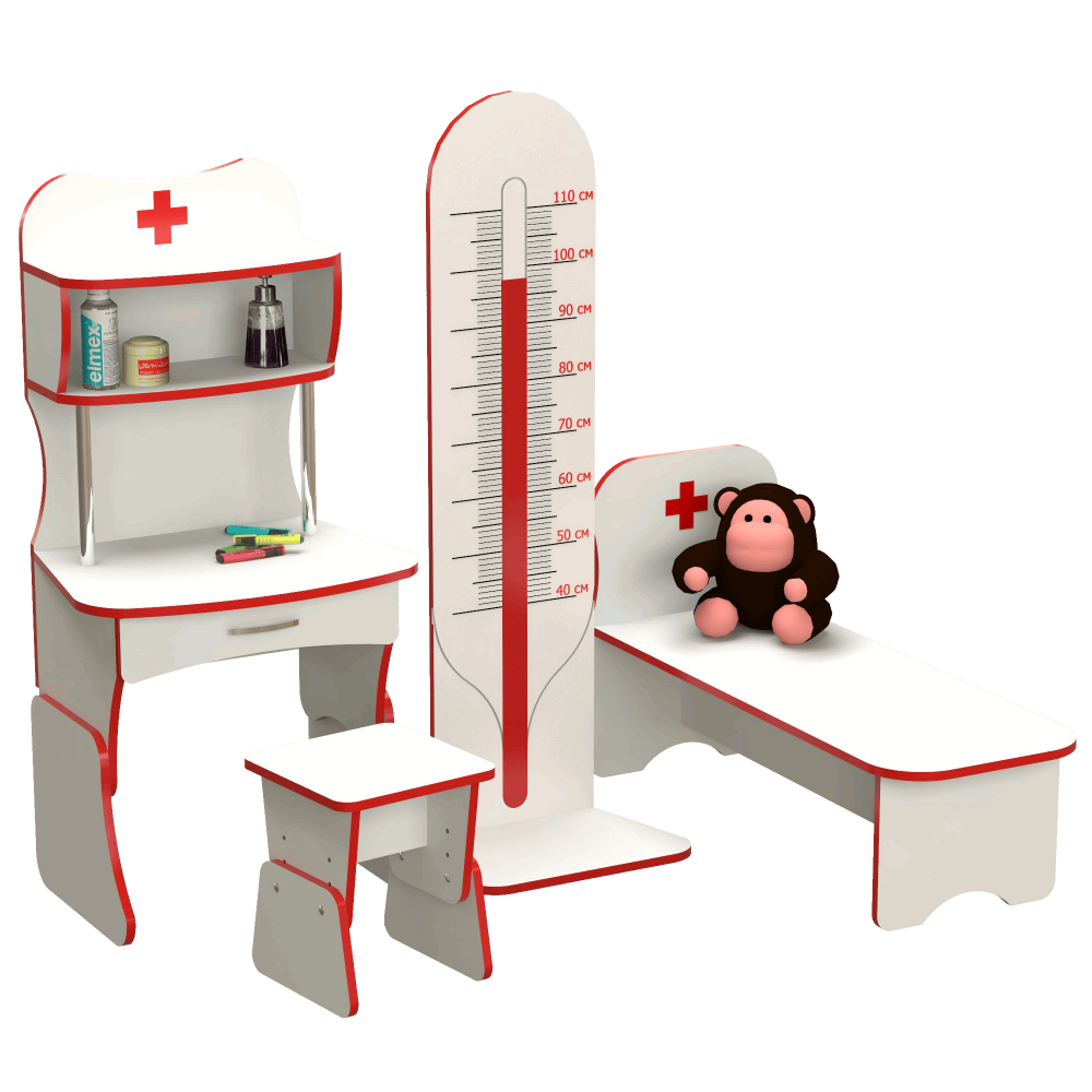 ?Больница? ? это комплект игровой мебели, в который входят несколько игровых зон, включая ?Кушетку?, ?Стол?, ?Ростомер? и стульчик 'Мишка', которые можно заказать по отдельности. Это оригинальный и интересный малышам комплект, который можно заказать в нашем интернет-магазине с доставкой во все регионы Украины.Характеристики изделияКлиенты, которых заинтересовала детская игровая мебель ?Больница?, могут приобрести её, оформив заказ на нашем сайте. Сроки изготовления зависят от загруженности нашего производства и оговариваются при обработке или оформлении Вашего заказа.Основной материал, из которого изготовлено это изделие ? ламинированная ДСП толщиной 16 мм, класса эмиссии Е1. Торцы ЛДСП покрыты кромкой толщиной 0,5 и 1 мм, изготовленной из ПВХ. Использованные для изготовления этого изделия материалы разрешены украинским санитарным законодательством для применения в учебных заведениях.Особенности и преимуществаКак и другие наши изделия, предназначенные для маленьких детей, игровая мебель ?Больница? имеет скруглённые углы, благодаря чему дети не могут зацепиться за угол одеждой или случайно ушибиться. Это делает стенку безопаснее для малышей.Данная игровая мебель имеет возможность регулировки высоты, чтобы сделать её удобной для детей разного роста. Отдельные её элементы можно использовать в качестве самостоятельных игровых зон. Игра с применением такой красивой и тематической игровой мебели, как набор ?Больница?, будет особенно интересной детям в возрасте от 5 лет.Гарантийный термин эксплуатации изделия составляет 12 месяцев.