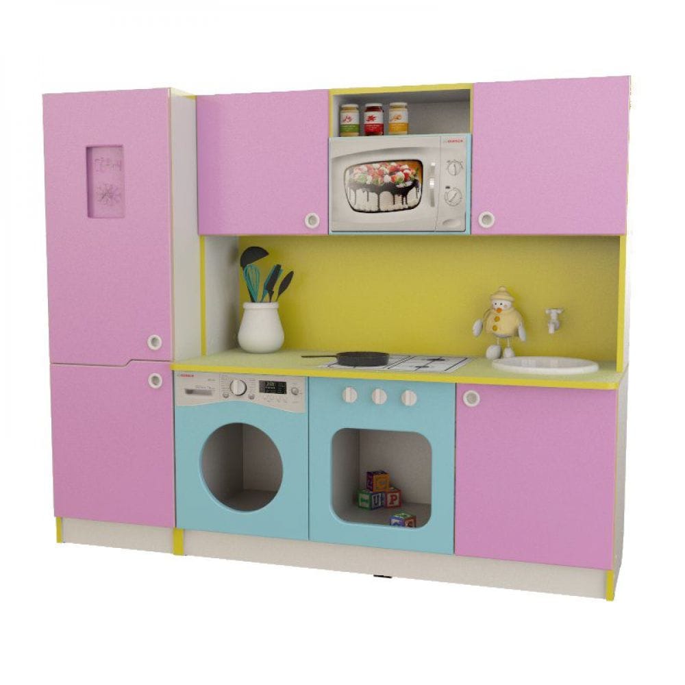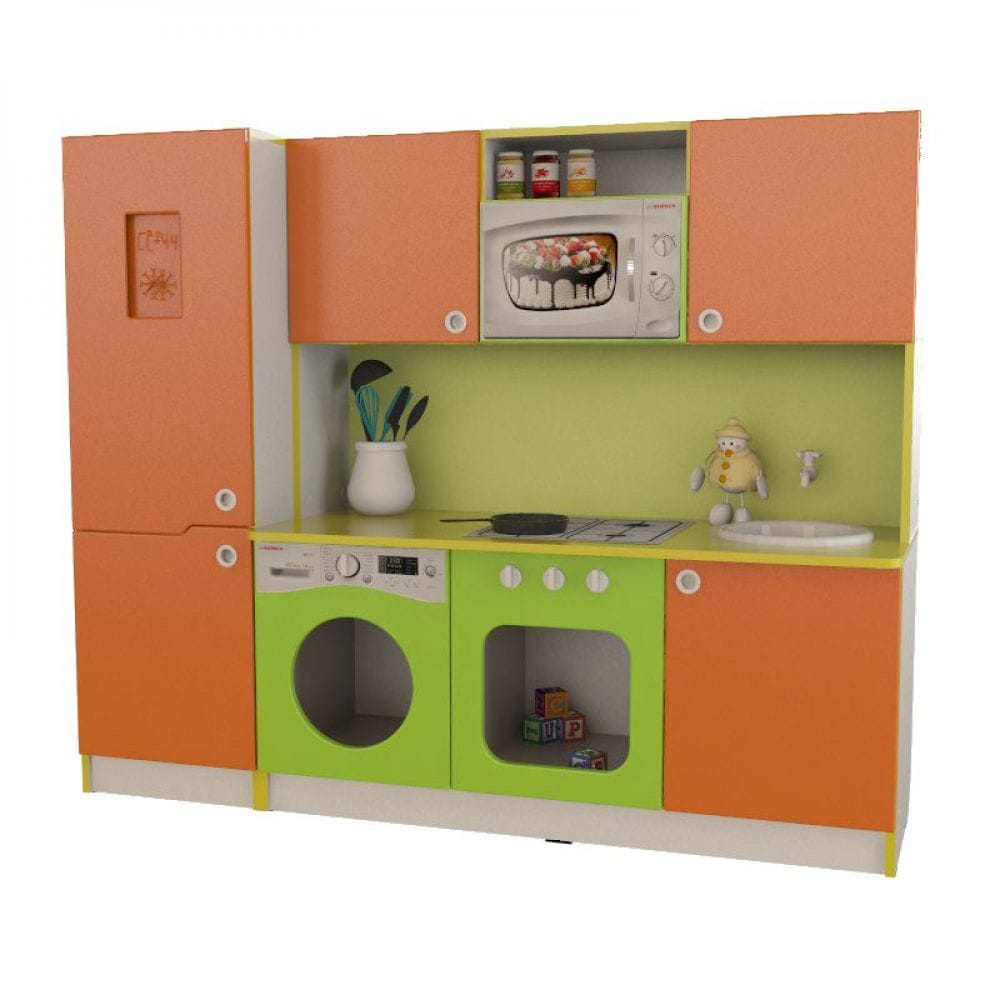 Красивая, оригинальная детская игровая кухня, которая предназначена для того, чтобы малыши могли с её помощью весело и интересно проводить время в детском саду. Особенно интересной эта игровая мебель будет для детей в возрасте от 5 лет.Характеристики изделияПредлагаемая нашим интернет-магазином игровая кухня для детского сада сделана из прочных и безопасных материалов, которые разрешены действующим санитарным законодательством Украины для использования в дошкольных учебных заведениях. Основа конструкции изготовлена из ДСП толщиной 16 мм, класса эмиссии Е1. Торцы этого материала покрыты кромкой, сделанной из ПВХ, толщиной 0,5 и 1 мм. Фасады изготовлены из МДФ.Конструкция игровой кухни для детского сада имитирует настоящую кухню ? это шкаф в виде холодильника с двумя отделениями, основным и морозильной камерой, модули, имитирующие стиральную машину и печку, рабочая поверхность, верхние шкафчики с фасадами. Габаритные размеры конструкции (ШхГхВ) ? 1600х430х1250 мм, вес ? 91 кг.Особенности и преимуществаМы предлагаем специалистам, формирующим игровые зоны для малышей в дошкольном учебном заведении, купить детскую игровую кухню, которая вызывает живой интерес у малышей. Все углы этого изделия скруглены, что делает его безопаснее. Наши покупатели могут выбрать один из трёх вариантов расцветки изделия, предлагаемых нами по умолчанию.Гарантийный термин эксплуатации изделия ? 12 месяцев.