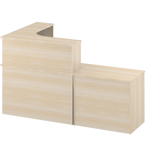 Стойка ресепшн цвета Дуб молочный - выполнена из ЛДСП. Толщина столешницы столов 22 мм Крёпежная и лицевая фурнитура производства России. Состоит из: ПСУ-11 Угловой элемент 120*120*118 см - 1 шт СТЦ-41 Стол с царгой в пол 90*60*76 см - 1 шт * дополнительно можно заказать стяжки в стоимость не включено