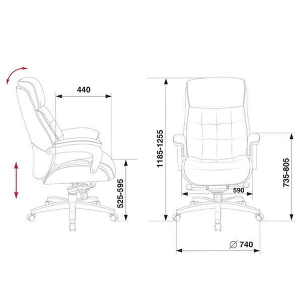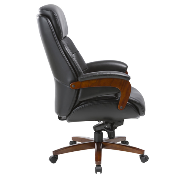 Механизм со смещенной осью качания с регулировкой под вес и фиксацией в нескольких положениях Регулировка высоты (газлифт) Крестовина стальная с деревянными накладками Подлокотники деревянные цвета 'орех' с накладками из натуральной кожи Колеса пластиковые