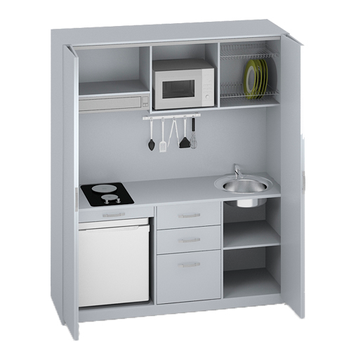 Далеко не каждый человек, работающий в офисе, может позволить себе вкусно поесть. Зачастую, кухня в офисном помещении бывает и не предусмотрена, особенно, если площадь всего предприятия невелика и на счету каждый квадратный метр. В таком случае, настоящим спасением для сотрудников может оказаться этот шкаф - мини-кухня для офиса. Его габариты 69х60х200 см, позволят установить его практически везде, а большое количество полок, удобных ящиков и выдвижная столешница позволят не отказывать себе в полноценном питании даже на работе. Если вы волнуетесь о совместимости этой кухни с общим интерьером помещения, то вы делаете это абсолютно напрасно - цвет светло серый, отлично подойдет для любого офиса.
