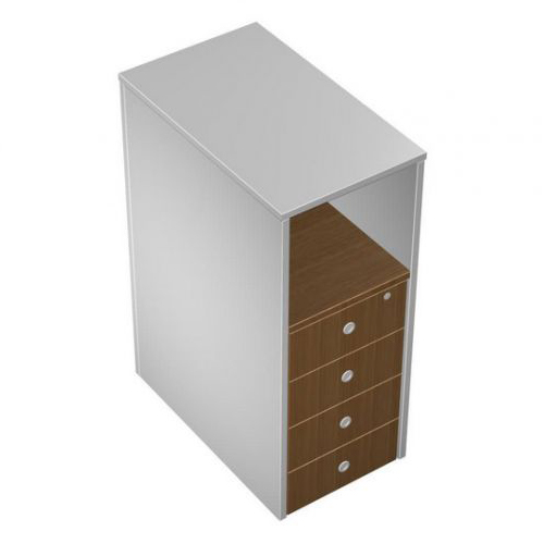 Стойка ресепшн угловая с 2-мя тумбами 4 ящичная с нишей левая, выдвижным блоком одежда-документы правая левая. Столешницы выполнены из ЛДСП толщиной 25 мм, Орех ногаро. Передняя панель, каркас тумбы, крышка, угловая полка выполнены из ЛДСП толщиной 25 мм, Белый премиум. Торцевые кромки по периметру облицованы материалом кромочным из ПВХ толщиной 2 мм в цвет ЛДСП. На нижние торцы передних панелей и боковин угловой полки установлены регулируемые по высоте опоры для выравнивания неровностей пола до 10 мм. Столешницы установлены на высоте 75,7 см. Полка ресепшен состоит из горизонтальной и вертикальной панелей, которые соединяются при помощи эксцентриковой стяжки, направляющих шкантов и металлических кронштейнов. Ширина горизонтальной полки 32 см. Проем между столешницей и полкой составляет 38 см. Задняя стенка тумбы - 18 мм, Белый премиум. Выдвижные ящики тумбы состоят из металлического корпуса и фасадной панели. Ящики устанавливаются на металлические роликовые направляющие, выдвижения на 4/5 глубины. Внутренний размер ящика ШхГхВ 36х44х7 см. Металлическая врезная ручка в форме круга D=40 мм, цвет хром матовый. Замок закрывает только верхний выдвижной ящик. Металлический складывающийся ключ с пластиковым наконечником.