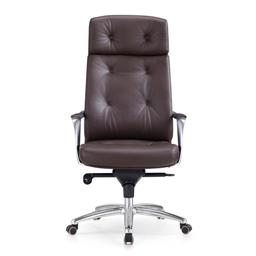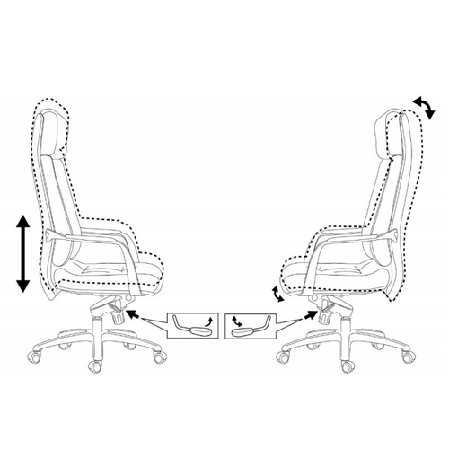Регулировка высоты (газлифт). Механизм со смещенной осью качания с фиксацией в 4-х положениях. Высокая спинка с подголовником. Подлокотники металлические хромированные с накладками из натуральной кожи. Крестовина металлическая (полированный алюминий). Материал обивки: натуральная кожа высшего качества.