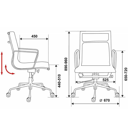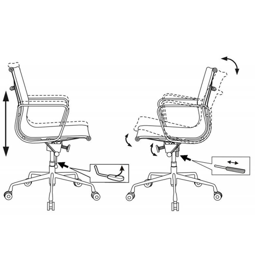 Механизм качания с регулировкой под вес и фиксацией в вертикальном положении Регулировка высоты (газлифт) Каркас металлический (полированный алюминий) Подлокотники металлические (полированный алюминий) Крестовина металлическая хромированная Материал обивки: сетка (ПВХ + полиэстер)