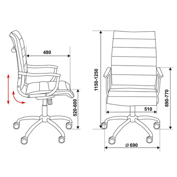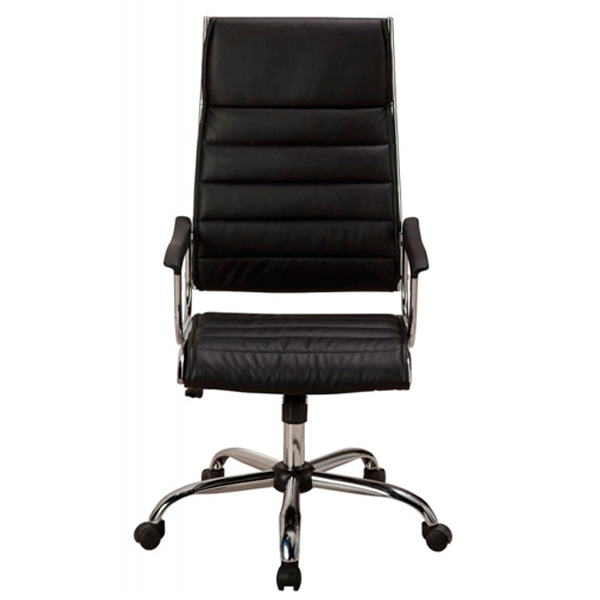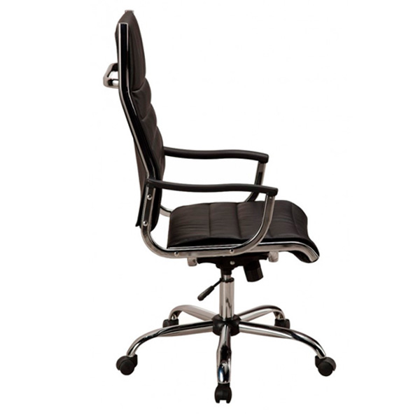 Офисное кресло современного дизайна Конструкция: Высокая спинка Механизм качания с регулировкой под вес и фиксацией в вертикальном положении Каркас металлический хромированный Подлокотники металлические хромированные с пластиковыми накладками Регулировка высоты (газлифт)