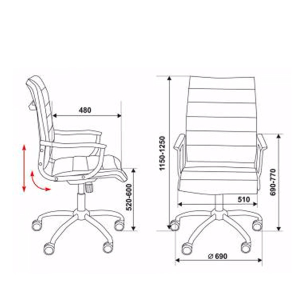 Кресло руководителя современного дизайна Конструкция: Высокая спинка Механизм качания с регулировкой под вес и фиксацией в вертикальном положении Каркас металлический хромированный Подлокотники металлические хромированные с пластиковыми накладками