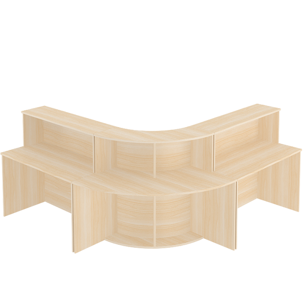 Закругленная стойка ресепшен выполнена из ЛДСП, толщина столешницы 22 мм, боковые стенки ? 16 мм. Торцы деталей обработаны противоударной износостойкой кромочной лентой ПВХ толщиной 2 мм немецкого концерна ?REHAU?. Крёпежная и лицевая фурнитура производства России. Глубина торцов - 60 см В состав входит: ПСУ-71 угловой элемент 112/112/118 см - 1 шт СТ-41 стол с царгой в пол 90/60/76 см - 2 шт Н-83 надставка 90/32/42 см - 2 шт *возможна компоновка с другими размерами, информацию уточняйте у менеджеров * дополнительно можно заказать стяжки в стоимость не включено