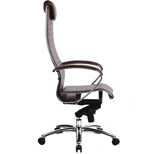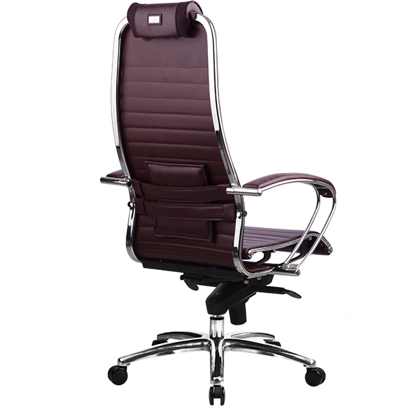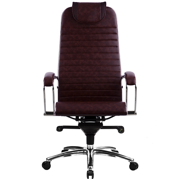 Отличие от других моделей серии Samurai: - высокая спинка кресла с мягким накладным подголовником, - натяжное кожаное сиденье и спинка (дополнительно комплектуется съемным особо мягким кожаным чехлом для сиденья) из износостойкого перфорированного материала NewLeather. - стальные подлокотники с мягкой накладкой из износостойкого материала NewLeather. Преимущества: Абсолютно эргономичная форма спинки соответствует анатомической форме тела человека, Новая эргономичная форма спинки, помимо улучшения эргономических свойств, придает креслу устойчивость при максимальном отклонении Двухзонная регулировка подпора поясницы обеспечивает идеальную поддержку спины независимо от комплекции сидящего, Двухзонная регулировка жесткости сиденья позволяет достичь максимального удобства (сиденье можно сделать мягче или жестче), а также при необходимости настроить угол наклона сиденья за счет разного натяжения передней и задней зоны, Сверхпрочный стальной каркас спинки и сиденья, покрытый зеркальным хромом, Гарантия 10 лет: на стальной каркас, Синхромеханизм качания MULTIBLOCK, благодаря раздельному синхронному отклонению спинки и сиденья, позволяет телу периодически разгибаться, что улучшает кровоток и разминает мышцы спины, Возможность фиксации кресла в любом положении отклонения, Смещенный вперед центр качания позволяет стопам сидящего, при отклонении кресла, оставаться на полу, сосуды не пережимаются - сохраняется ощущение легкости в ногах, Регулировка глубины сиденья с помощью специального слайдера, обеспечивает эргономически правильную посадку пользователя в кресле, создавая дополнительный комфорт и удобство. Предусмотрена возможность фиксации глубины сиденья в пяти позициях. Пятилучье зеркальное литое с противооткатными полиуретановыми роликами, Противооткатные полиуретановые ролики обеспечивают дополнительную безопасность эксплуатации кресла: без нагрузки - предотвращают случайное перемещение кресла, при сидении - позволяют легко перемещаться. Ролики долговечные, бесшумные, не оставляют следов и царапин на полу, увеличенного диаметра (60 мм), Подголовник: мягкий комфортный из перфорированного износостойкого материала NewLeather*, Обновленный дизайн подголовника: Подлокотники: стальные, покрытые зеркальным хромом, с мягкими накладками из износостойкого материала NewLeather*, Материалы обивки спинки и сиденья: перфорированный износостойкий материал NewLeather*. *NewLeather ? инновационный экологически чистый материал, производимый из натуральной кожи, армирован нейлоновой нитью, имеет волокнистую натуральную основу, благодаря чему данный материал не уступает обычной натуральной коже по эластичности, прочности и износостойкости. При этом перфорация обеспечивает уникальные ?дышащие? свойства, не уступающие даже ткани и значительно превосходящие ?дышащие? свойства обычной натуральной кожи. **Высота сиденья в верхнем и нижнем положении может быть изменена, в зависимости от модели применяемого газ-лифта.