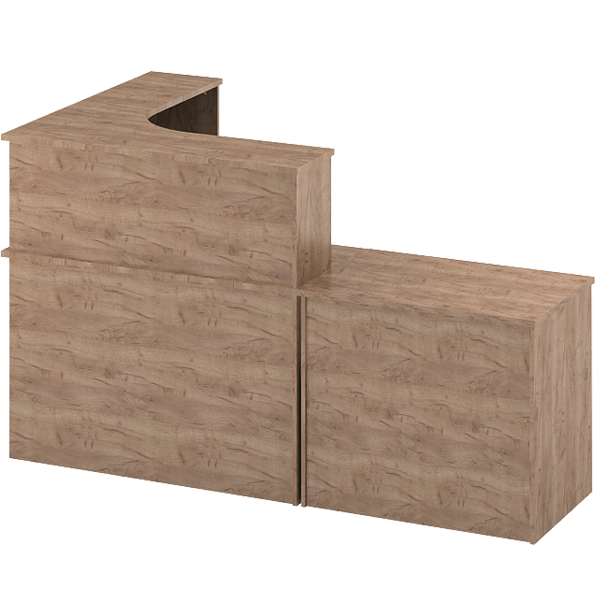 Стойка ресепшн цвета Дуб Крафт Табачный - выполнена из ЛДСП. Толщина столешницы столов 22 мм Крёпежная и лицевая фурнитура производства России. Состоит из: ПСУ-11 Угловой элемент 120*120*118 см - 1 шт СТЦ-41 Стол с царгой в пол 90*60*76 см - 1 шт * дополнительно можно заказать стяжки в стоимость не включено