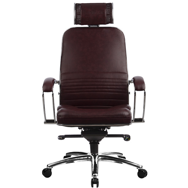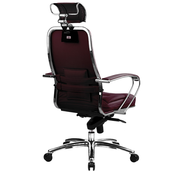 Отличие от других моделей серии Samurai: - укороченная натяжная кожаная спинка со съемным 3D подголовником, - мягкое объемное сиденье из износостойкого перфорированного материала NewLeather*, - стальные подлокотники с мягкой накладкой из износостойкого материала NewLeather*. Преимущества: Абсолютно эргономичная форма спинки соответствует анатомической форме тела человека, Новая эргономичная форма спинки, помимо улучшения эргономических свойств, придает креслу устойчивость при максимальном отклонении. Двухзонная регулировка подпора поясницы обеспечивает идеальную поддержку спины независимо от комплекции сидящего, Сверхпрочный стальной каркас спинки и сиденья, покрытый зеркальным хромом, Гарантия 10 лет: на стальной каркас, Синхромеханизм качания MULTIBLOCK, благодаря раздельному синхронному отклонению спинки и сиденья, позволяет телу периодически разгибаться, что улучшает кровоток и разминает мышцы спины, Возможность фиксации кресла в любом положении отклонения, Смещенный вперед центр качания позволяет стопам сидящего, при отклонении кресла, оставаться на полу, сосуды не пережимаются - сохраняется ощущение легкости в ногах, Регулировка глубины сиденья с помощью специального слайдера, обеспечивает эргономически правильную посадку пользователя в кресле, создавая дополнительный комфорт и удобство. Предусмотрена возможность фиксации глубины сиденья в пяти позициях. Пятилучье зеркальное литое с противооткатными полиуретановыми роликами, Противооткатные полиуретановые ролики обеспечивают дополнительную безопасность эксплуатации кресла: без нагрузки - предотвращают случайное перемещение кресла, при сидении - позволяют легко перемещаться. Ролики долговечные, бесшумные, не оставляют следов и царапин на полу, увеличенного диаметра (60 мм), Подголовник: Съемный 3D подголовник из перфорированного износостойкого материала NewLeather*, обеспечивает идеальную поддержку головы в любом положении. Регулируется по высоте, глубине, углу наклона. Каркас подголовника: стальной, покрытый зеркальным хромом, Подлокотники: стальные, покрытые зеркальным хромом, с мягкими накладками из износостойкого материала NewLeather, Мягкое объемное сиденье обеспечивает дополнительный комфорт и ощущение мягкости кожаного дивана, Материалы обивки спинки и сиденья: перфорированный износостойкий материал NewLeather*. *NewLeather ? инновационный экологически чистый материал, производимый из натуральной кожи, армирован нейлоновой нитью, имеет волокнистую натуральную основу, благодаря чему данный материал не уступает обычной натуральной коже по эластичности, прочности и износостойкости. При этом перфорация обеспечивает уникальные ?дышащие? свойства, не уступающие даже ткани и значительно превосходящие ?дышащие? свойства обычной натуральной кожи. **Высота сиденья в верхнем и нижнем положении может быть изменена, в зависимости от модели применяемого газ-лифта.
