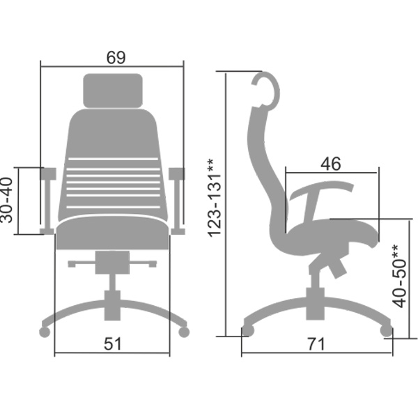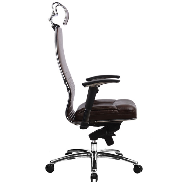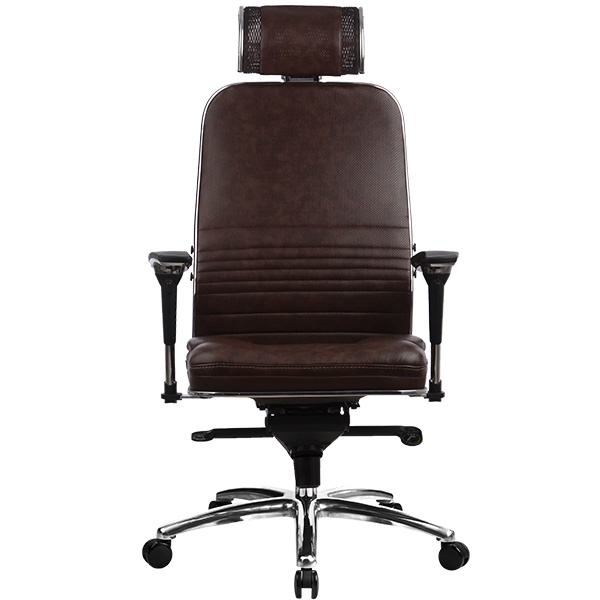Отличие от других моделей серии Samurai: - укороченная натяжная кожаная спинка со съемным 3D подголовником, - мягкое объемное сиденье из износостойкого перфорированного материала NewLeather*, - регулируемые 4D подлокотники. Преимущества: Абсолютно эргономичная форма спинки соответствует анатомической форме тела человека. Новая эргономичная форма спинки, помимо улучшения эргономических свойств, придает креслу устойчивость при максимальном отклонении. Двухзонная регулировка подпора поясницы обеспечивает идеальную поддержку спины независимо от комплекции сидящего, Сверхпрочный стальной каркас спинки и сиденья, покрытый зеркальным хромом, Гарантия 10 лет: на стальной каркас, Синхромеханизм качания MULTIBLOCK, благодаря раздельному синхронному отклонению спинки и сиденья, позволяет телу периодически разгибаться, что улучшает кровоток и разминает мышцы спины, Возможность фиксации кресла в любом положении отклонения, Смещенный вперед центр качания позволяет стопам сидящего, при отклонении кресла, оставаться на полу, сосуды не пережимаются - сохраняется ощущение легкости в ногах, Регулировка глубины сиденья с помощью специального слайдера, обеспечивает эргономически правильную посадку пользователя в кресле, создавая дополнительный комфорт и удобство. Предусмотрена возможность фиксации глубины сиденья в пяти позициях. Пятилучье зеркальное литое с противооткатными полиуретановыми роликами, Противооткатные полиуретановые ролики обеспечивают дополнительную безопасность эксплуатации кресла: без нагрузки - предотвращают случайное перемещение кресла, при сидении - позволяют легко перемещаться. Ролики долговечные, бесшумные, не оставляют следов и царапин на полу, увеличенного диаметра (60 мм), Подголовник: Съемный 3D подголовник из перфорированного износостойкого материала NewLeather*, обеспечивает идеальную поддержку головы в любом положении. Регулируется по высоте, глубине, углу наклона. Каркас подголовника: стальной, покрытый зеркальным хромом, Регулируемые 4D подлокотники настраиваются под индивидуальные особенности рабочего места пользователя, разгружают плечи и предплечья сидящего, регулируются по высоте, углу поворота, а также меняется расстояние между подлокотниками, *регулировка высоты *регулировка расстояния между подлокотниками *регулировка угла поворота *регулировка вперед-назад Мягкое объемное сиденье обеспечивает дополнительный комфорт и ощущение мягкости кожаного дивана, Материалы обивки спинки и сиденья: перфорированный износостойкий материал NewLeather*. *NewLeather ? инновационный экологически чистый материал, производимый из натуральной кожи, армирован нейлоновой нитью, имеет волокнистую натуральную основу, благодаря чему данный материал не уступает обычной натуральной коже по эластичности, прочности и износостойкости. При этом перфорация обеспечивает уникальные ?дышащие? свойства, не уступающие даже ткани и значительно превосходящие ?дышащие? свойства обычной натуральной кожи. **Высота сиденья в верхнем и нижнем положении может быть изменена, в зависимости от модели применяемого газ-лифта.