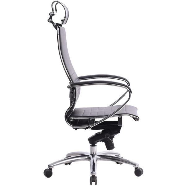 Отличие от других моделей серии Samurai: - укороченная спинка со съемным 3D подголовником, - натяжное кожаное сиденье и спинка (дополнительно комплектуется съемным особо мягким кожаным чехлом для сиденья) из износостойкого перфорированного материала NewLeather*. - стальные подлокотники с мягкой накладкой из износостойкого материала NewLeather*. Преимущества: Абсолютно эргономичная форма спинки соответствует анатомической форме тела человека, Новая эргономичная форма спинки, помимо улучшения эргономических свойств, придает креслу устойчивость при максимальном отклонении. Двухзонная регулировка подпора поясницы обеспечивает идеальную поддержку спины независимо от комплекции сидящего, Двухзонная регулировка жесткости сиденья позволяет достичь максимального удобства (сиденье можно сделать мягче или жестче), а также при необходимости настроить угол наклона сиденья за счет разного натяжения передней и задней зоны, Сверхпрочный стальной каркас спинки и сиденья, покрытый зеркальным хромом, Гарантия 10 лет: на стальной каркас, Синхромеханизм качания MULTIBLOCK, благодаря раздельному синхронному отклонению спинки и сиденья, позволяет телу периодически разгибаться, что улучшает кровоток и разминает мышцы спины, Возможность фиксации кресла в любом положении отклонения, Смещенный вперед центр качания позволяет стопам сидящего, при отклонении кресла, оставаться на полу, сосуды не пережимаются - сохраняется ощущение легкости в ногах, Регулировка глубины сиденья с помощью специального слайдера, обеспечивает эргономически правильную посадку пользователя в кресле, создавая дополнительный комфорт и удобство. Предусмотрена возможность фиксации глубины сиденья в пяти позициях. Пятилучье зеркальное литое с противооткатными полиуретановыми роликами, Противооткатные полиуретановые ролики обеспечивают дополнительную безопасность эксплуатации кресла: без нагрузки - предотвращают случайное перемещение кресла, при сидении - позволяют легко перемещаться. Ролики долговечные, бесшумные, не оставляют следов и царапин на полу, увеличенного диаметра (60 мм), Подголовник: Съемный 3D подголовник из перфорированного износостойкого материала NewLeather*, обеспечивает идеальную поддержку головы в любом положении. Регулируется по высоте, глубине, углу наклона. Каркас подголовника: стальной, покрытый зеркальным хромом, Подлокотники: стальные, покрытые зеркальным хромом, с мягкими накладками из износостойкого материала NewLeather*, Материалы обивки спинки и сиденья: перфорированный износостойкий материал NewLeather*. *NewLeather ? инновационный экологически чистый материал, производимый из натуральной кожи, армирован нейлоновой нитью, имеет волокнистую натуральную основу, благодаря чему данный материал не уступает обычной натуральной коже по эластичности, прочности и износостойкости. При этом перфорация обеспечивает уникальные ?дышащие? свойства, не уступающие даже ткани и значительно превосходящие ?дышащие? свойства обычной натуральной кожи. **Высота сиденья в верхнем и нижнем положении может быть изменена, в зависимости от модели применяемого газ-лифта.