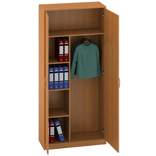 Каждый кабинет руководителя нуждается в определенной мебели. Шкаф для одежды - один из немаловажных предметов интерьера, полезный как для хозяина кабинета, так и для его гостей. Сейчас не так уж и просто найти классическую мебель, которая подошла бы к любому интерьеру, выглядела стильной и строгой, но этот шкаф - именно такой. Вы сами сможете выбрать наиболее подходящий для вас вариант расцветки. Надёжность и долгое время службы этого шкафа гарантировано качественным ЛДСП, использованным в его конструкции. Габариты этой модели - 200х93х37 см. Данный шкаф имеет две двери, в нём есть отдельная верхняя полка, а также, он предусматривает возможность подвешивания тремпелей.