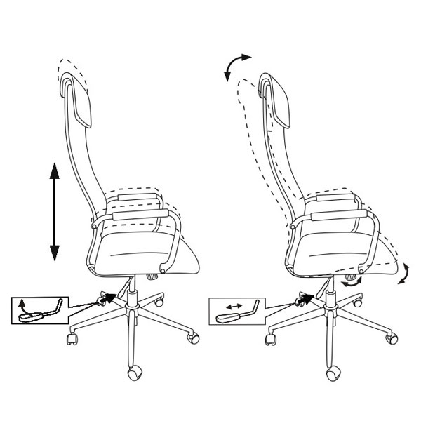Конструкция: Механизм качания с регулировкой под вес и фиксацией в вертикальном положении Подлокотники металлические хромированные с накладками из ткани Хромированная крестовина Регулировка высоты газлифт Материал обивки: спинка: сетчатая ткань искусственная кожа подголовник сиденье: сетчатая ткань