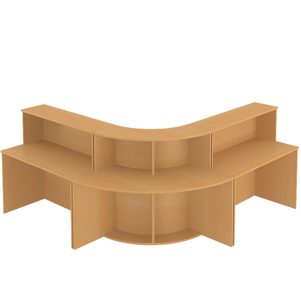 Закругленная стойка ресепшен выполнена из ЛДСП, толщина столешницы 22 мм, боковые стенки ? 16 мм. Торцы деталей обработаны противоударной износостойкой кромочной лентой ПВХ толщиной 2 мм немецкого концерна ?REHAU?. Крёпежная и лицевая фурнитура производства России. Глубина торцов - 60 см В состав входит: ПСУ-71 угловой элемент 112/112/118 см - 1 шт СТ-41 стол с царгой в пол 90/60/76 см - 2 шт Н-83 надставка 90/32/42 см - 2 шт *возможна компоновка с другими размерами, информацию уточняйте у менеджеров * дополнительно можно заказать стяжки в стоимость не включено