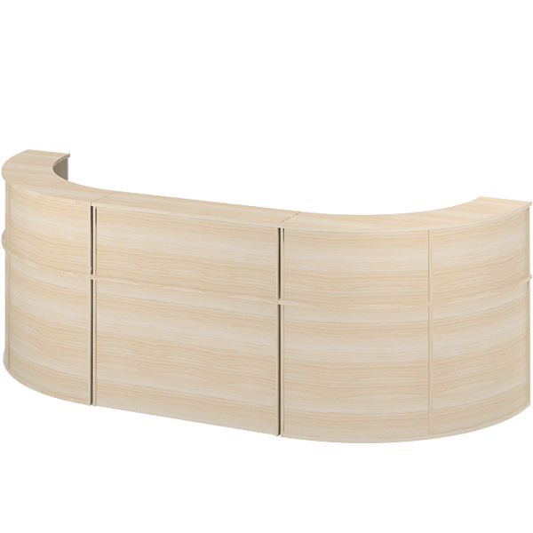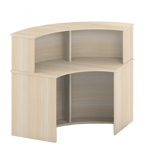 Стойка ресепшн округлая с нишами внутри, выполнена из ЛДСП, толщина столешницы 22 мм, боковые стенки ? 16 мм. Торцы деталей обработаны противоударной износостойкой кромочной лентой ПВХ толщиной 2 мм немецкого концерна ?REHAU?. Крёпежная и лицевая фурнитура производства России. Комплект состоит: ПСУ-70 Угловой элемент 112*112*118 см - 2 шт, Н-23 Надставка на стол 120*32*42 см - 1 шт, СТЦ-42 Стол с царгой в пол 120*60*76 см - 1 шт. * дополнительно можно заказать стяжки в стоимость не включено