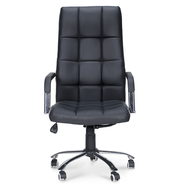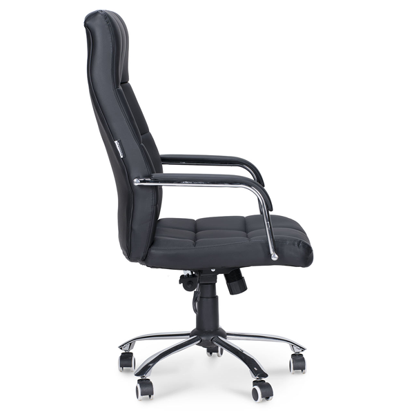Недорогое современное офисное кресло с декоративной отделкой сиденья и спинки. Покрытие - высококачественная экокожа. Крестовина и подлокотники стальные хромированные. С мягкой накладкой из экокожи на подлокотниках.