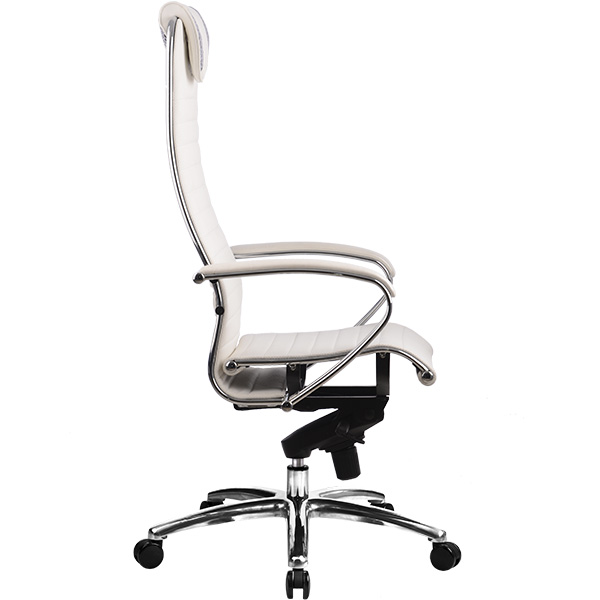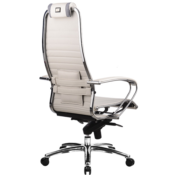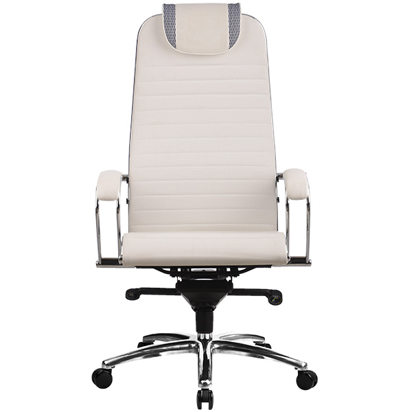 Отличие от других моделей серии Samurai: - высокая спинка кресла с мягким накладным подголовником, - натяжное кожаное сиденье и спинка (дополнительно комплектуется съемным особо мягким кожаным чехлом для сиденья) из износостойкого перфорированного материала NewLeather. - стальные подлокотники с мягкой накладкой из износостойкого материала NewLeather. Преимущества: Абсолютно эргономичная форма спинки соответствует анатомической форме тела человека, Новая эргономичная форма спинки, помимо улучшения эргономических свойств, придает креслу устойчивость при максимальном отклонении Двухзонная регулировка подпора поясницы обеспечивает идеальную поддержку спины независимо от комплекции сидящего, Двухзонная регулировка жесткости сиденья позволяет достичь максимального удобства (сиденье можно сделать мягче или жестче), а также при необходимости настроить угол наклона сиденья за счет разного натяжения передней и задней зоны, Сверхпрочный стальной каркас спинки и сиденья, покрытый зеркальным хромом, Гарантия 10 лет: на стальной каркас, Синхромеханизм качания MULTIBLOCK, благодаря раздельному синхронному отклонению спинки и сиденья, позволяет телу периодически разгибаться, что улучшает кровоток и разминает мышцы спины, Возможность фиксации кресла в любом положении отклонения, Смещенный вперед центр качания позволяет стопам сидящего, при отклонении кресла, оставаться на полу, сосуды не пережимаются - сохраняется ощущение легкости в ногах, Регулировка глубины сиденья с помощью специального слайдера, обеспечивает эргономически правильную посадку пользователя в кресле, создавая дополнительный комфорт и удобство. Предусмотрена возможность фиксации глубины сиденья в пяти позициях. Пятилучье зеркальное литое с противооткатными полиуретановыми роликами, Противооткатные полиуретановые ролики обеспечивают дополнительную безопасность эксплуатации кресла: без нагрузки - предотвращают случайное перемещение кресла, при сидении - позволяют легко перемещаться. Ролики долговечные, бесшумные, не оставляют следов и царапин на полу, увеличенного диаметра (60 мм), Подголовник: мягкий комфортный из перфорированного износостойкого материала NewLeather*, Обновленный дизайн подголовника: Подлокотники: стальные, покрытые зеркальным хромом, с мягкими накладками из износостойкого материала NewLeather*, Материалы обивки спинки и сиденья: перфорированный износостойкий материал NewLeather*. *NewLeather ? инновационный экологически чистый материал, производимый из натуральной кожи, армирован нейлоновой нитью, имеет волокнистую натуральную основу, благодаря чему данный материал не уступает обычной натуральной коже по эластичности, прочности и износостойкости. При этом перфорация обеспечивает уникальные ?дышащие? свойства, не уступающие даже ткани и значительно превосходящие ?дышащие? свойства обычной натуральной кожи. **Высота сиденья в верхнем и нижнем положении может быть изменена, в зависимости от модели применяемого газ-лифта.