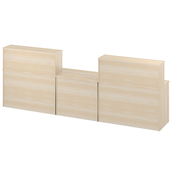 Стойка ресепшн цвета Дуб молочный - выполнена из ЛДСП. Толщина столешницы столов 22 мм Крёпежная и лицевая фурнитура производства России. Состоит из: Н-23 Надставка на стол 120*32*42 см - 2 шт СТЦ-47 Стол с царгой в пол 120*60*76 см - 2 шт СТЦ-41 Стол с царгой в пол 90*60*76 см - 1 шт * дополнительно можно заказать стяжки в стоимость не включено