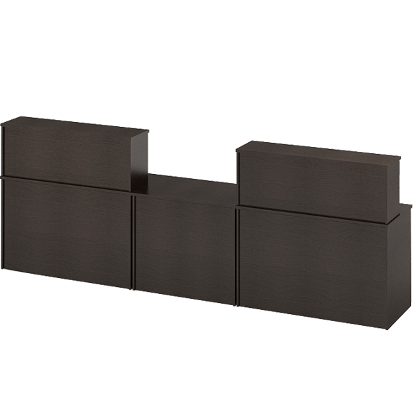 Стойка ресепшн цвета Венге - выполнена из ЛДСП. Толщина столешницы столов 22 мм Крёпежная и лицевая фурнитура производства России. Состоит из: Н-23 Надставка на стол 120*32*42 см - 2 шт СТЦ-47 Стол с царгой в пол 120*60*76 см - 2 шт СТЦ-41 Стол с царгой в пол 90*60*76 см - 1 шт * дополнительно можно заказать стяжки в стоимость не включено