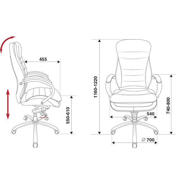 Механизм со смещенной осью качания с фиксацией в нескольких положениях Регулировка высоты (газлифт) Крестовина хромированная Подлокотники хромированные с мягкими накладками из иск.кожи.