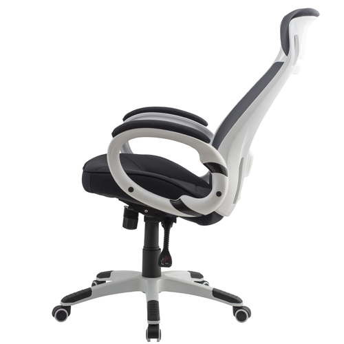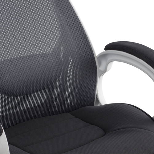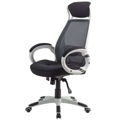 Сидение - ткань черная, спинка - сетка темно-серая Набивка поролон высокой плотности, Каркас немонолитный, Подголовник отдельный, Подлокотники пластиковые, Накладки подлокотников тканевые, черные, Механизм качания с регулировкой под вес и возможностью фиксации в нескольких положениях, подъёмно-поворотный, Крестовина пластиковая. Высота от пола до подлокотников - 68-75 см